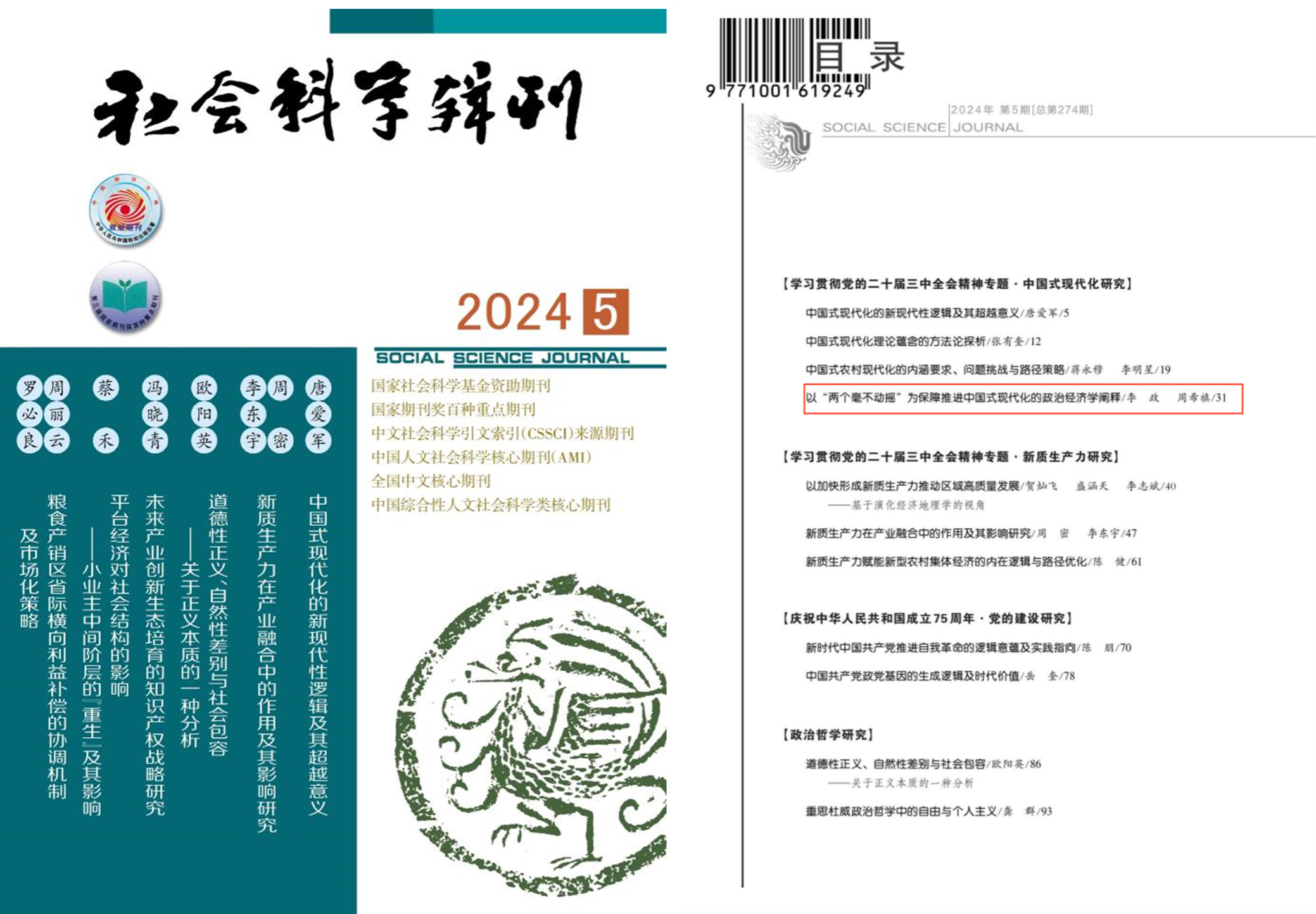 经济学院李政教授、湖南湘江研究院研究员周希禛合作论文《以“两个毫不动摇”为保障推进中国式现代化的政治经济学阐释》在《社会科学辑刊》2024年第5期发表。