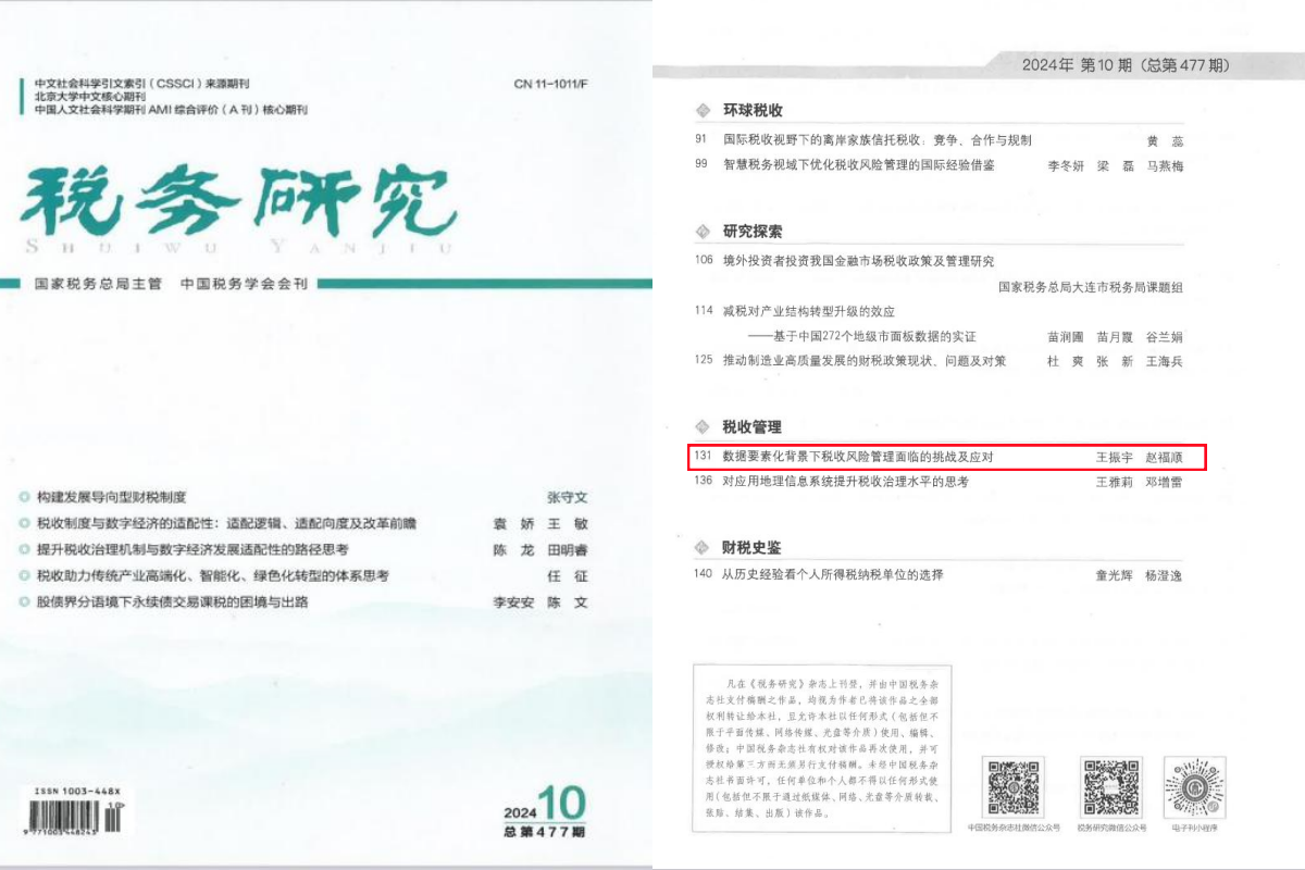 经济学院王振宇教授与博士研究生赵福顺合作撰写的论文《数据要素化背景下税收风险管理面临的挑战及应对》在《税务研究》2024年第10期上发表。