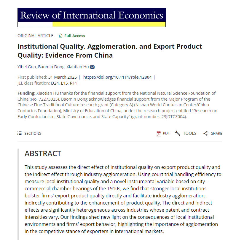 近日,国产一区二区日本在线经济学部副主任董保民教授与河南大学商学院讲师郭益蓓、北京工商大学经济学院讲师胡晓天合作撰写的学术论文“Institutional Quality, Agglomeration, and Export Product Quality: Evidence From China”在国际经济学著名期刊Review of International Economics发表。